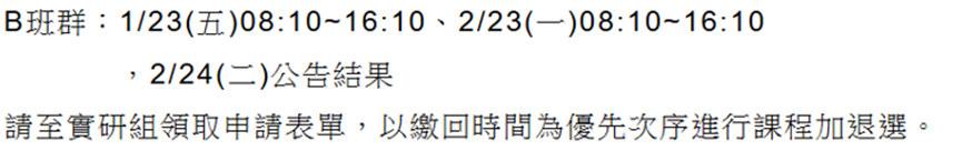 A班群: 3/6(五)08:10~16:10 ~3/9(一)08:10~16:10,3/10(二)公告結果
