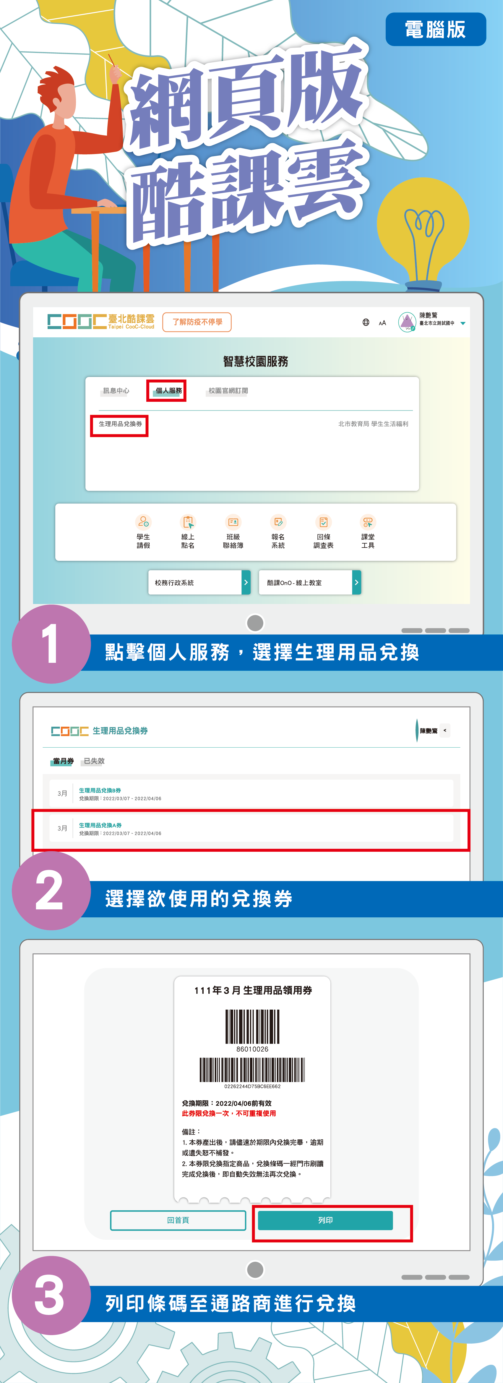 1、使用電腦:以學生帳號密碼登入親師生平臺,列印兌換券。請貴校務必瞭解學生需求並協助學生使用學校電腦及印表機。