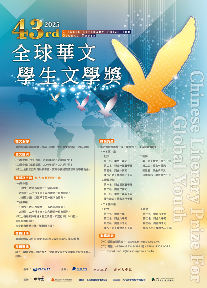 一、「第43屆全球華文學生文學獎」徵文對象為海內外目前就 讀高中職、國中或同等學力,並以華文書寫者,均可參 加。