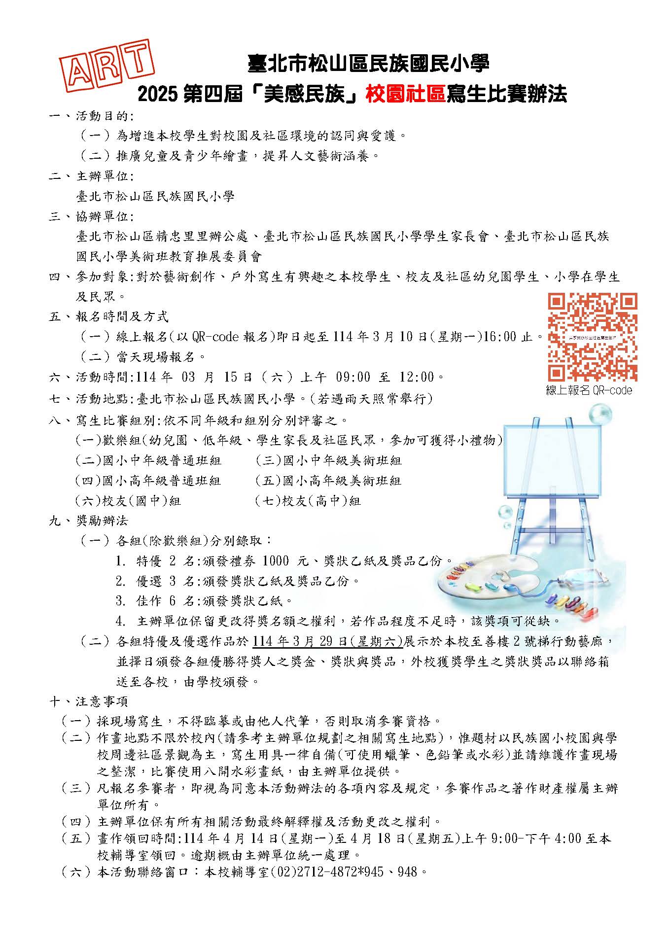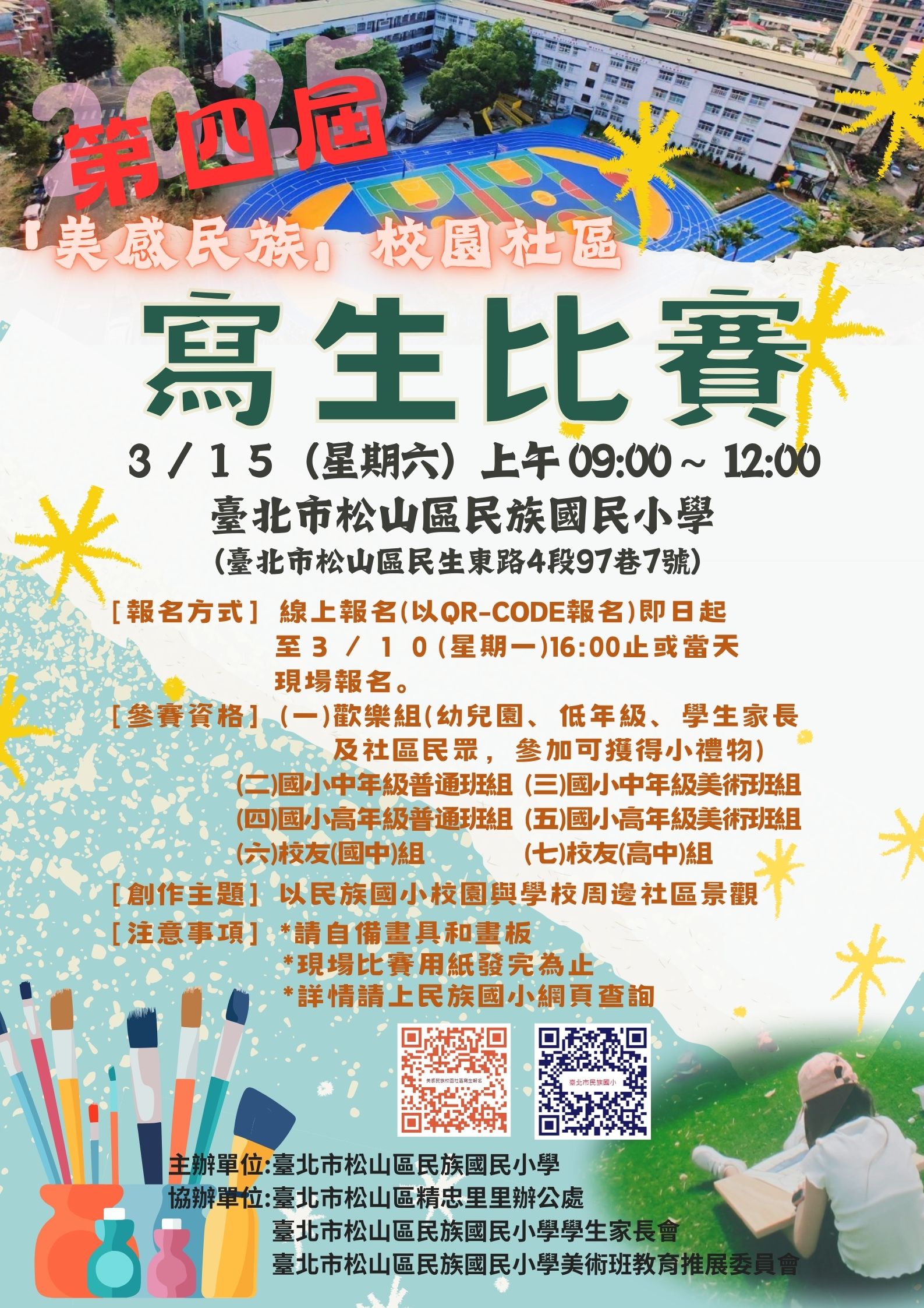 一、比賽時間:114年3月15日(星期六)早上9時至12時整。比賽地點:臺北市民族國小(臺北市松山區民生東路四段97巷7 號),若遇雨天照常舉行。